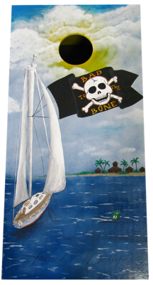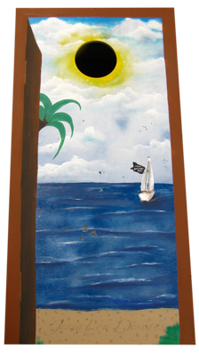 This awesomely unique corn-hole set was made for a man who loves to go sailing as a surprise from his wife for his birthday. The left piece is taken from the view of the inside of a hut looking out to the ship. The right piece is taken from out at sea looking towards the huts. It is painted with acrylics and then sealed so the wood is very slippery. The corn-hole set is painted on all sides, and holds a lot of memories from the man’s sailing trips. Each set is unique to the individual.